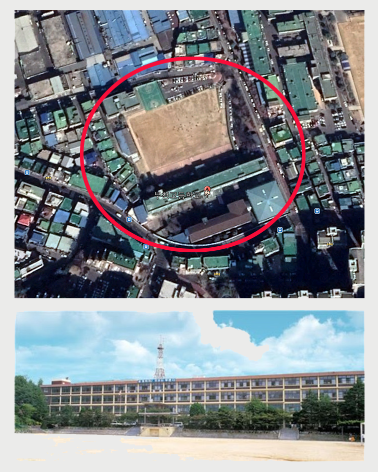 위의 빨간색 원과 위의 아래 사진은 부천 고등학교 모습입니다.