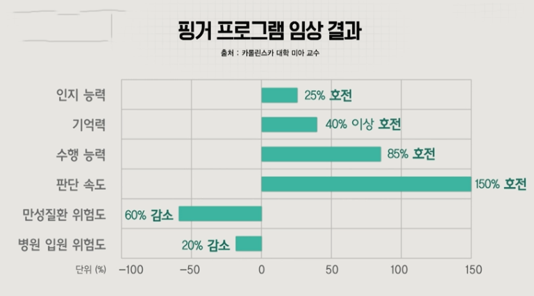 위의 그래프는 핑거 프로그램 임상 결과인데요. 아무런 약물치료 없이 뇌의 여러 기능에서 호전되는 결과를 얻었습니다.
