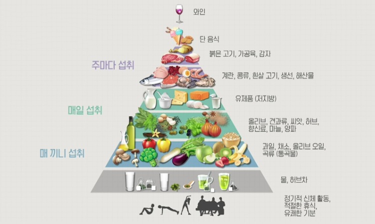 매일 섭취해야 할 것은 올리브, 견과류, 씨앗, 허브, 향신료, 마늘, 양파, 저지방 유제품이고요.