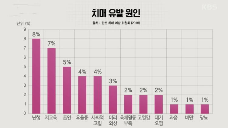 위의 그림이 치매 유발 원인인데요. 란셋 치매 예방 위원회에서 2018년 발표한 자료입니다. 1위는 난청, 2위는 저 교육, 3위는 흡연, 4위는 우울증, 4위는 사회적 고립, 6위는 머리 외상, 7위는 육체 활동 부족, 7위는 고혈압, 7위는 대기오염, 10위는 과음, 10위는 비만, 10위는 당뇨입니다.