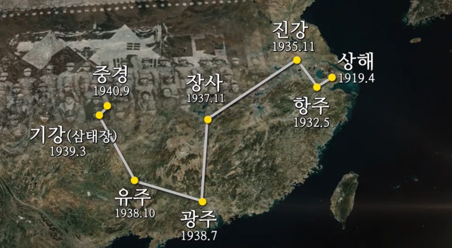 이동시기는 일제의 핍박이 너무 심해서 도망 다니냐 이동을 많이 한 것인데요. 저 이동시기의 시작이 윤봉길 의사 도시락 폭탄 사건입니다. 아래는 이동시기에 대한민국 임시정부가 이동한 경로입니다.