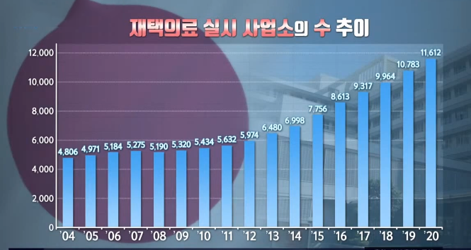 위의 그래프에서 볼 수 있는 것처럼 재택의료를 하는 사설 진료소의 수도 계속 증가추세에 있습니다.