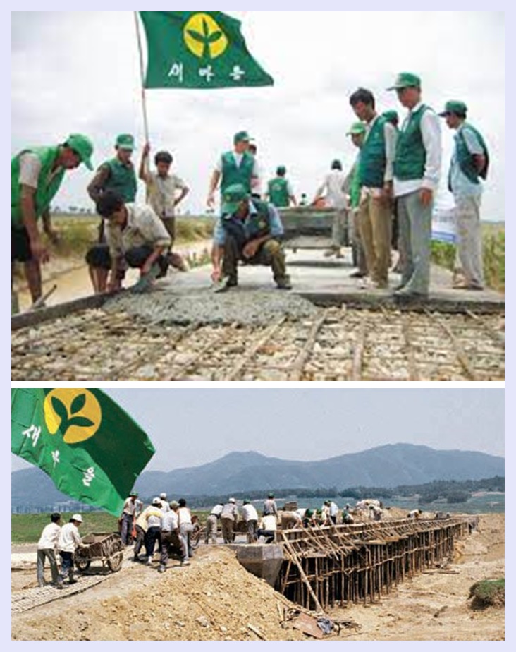우리나라 지하자원 중 매장량이 가장 풍부한 것이 시멘트의 원료가 되는 석회석입니다. 석회석 원료가 풍부하니까 시멘트 공장이 많이 생겨났는데요. 시멘트가 너무 많이 생산되니까 거기서 생산하는 시멘트들이 시장에서 다 소비가 안 되는 겁니다. 이때 가장 큰 시멘트 공장이 쌍용 시멘트라고 김성곤 사장이 소유주였습니다. 그리고 공화당의 재정 담당이었는데요. 김성곤이라는 인물이 박정희 대통령에게 시멘트 소비를 할 수 있게 해달라고 건의를 합니다. 그래서 새마을 운동 때 시멘트가 많이 공급되었다고 합니다.