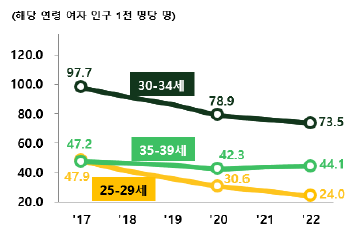 위의 대한민국 출산율 통계는 모의 나이별 출산율입니다. 35세 미만 연령층의 출산율은 감소하고, 35세 이상 연령층의 출산율이 증가했습니다.