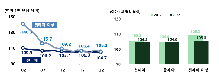 위의 대한민국 출산율 통계는 출생 성비를 보여주는 그래프입니다. 전체 출생 성비는 104.7명으로 전년 대비 0.4명 감소했습니다.