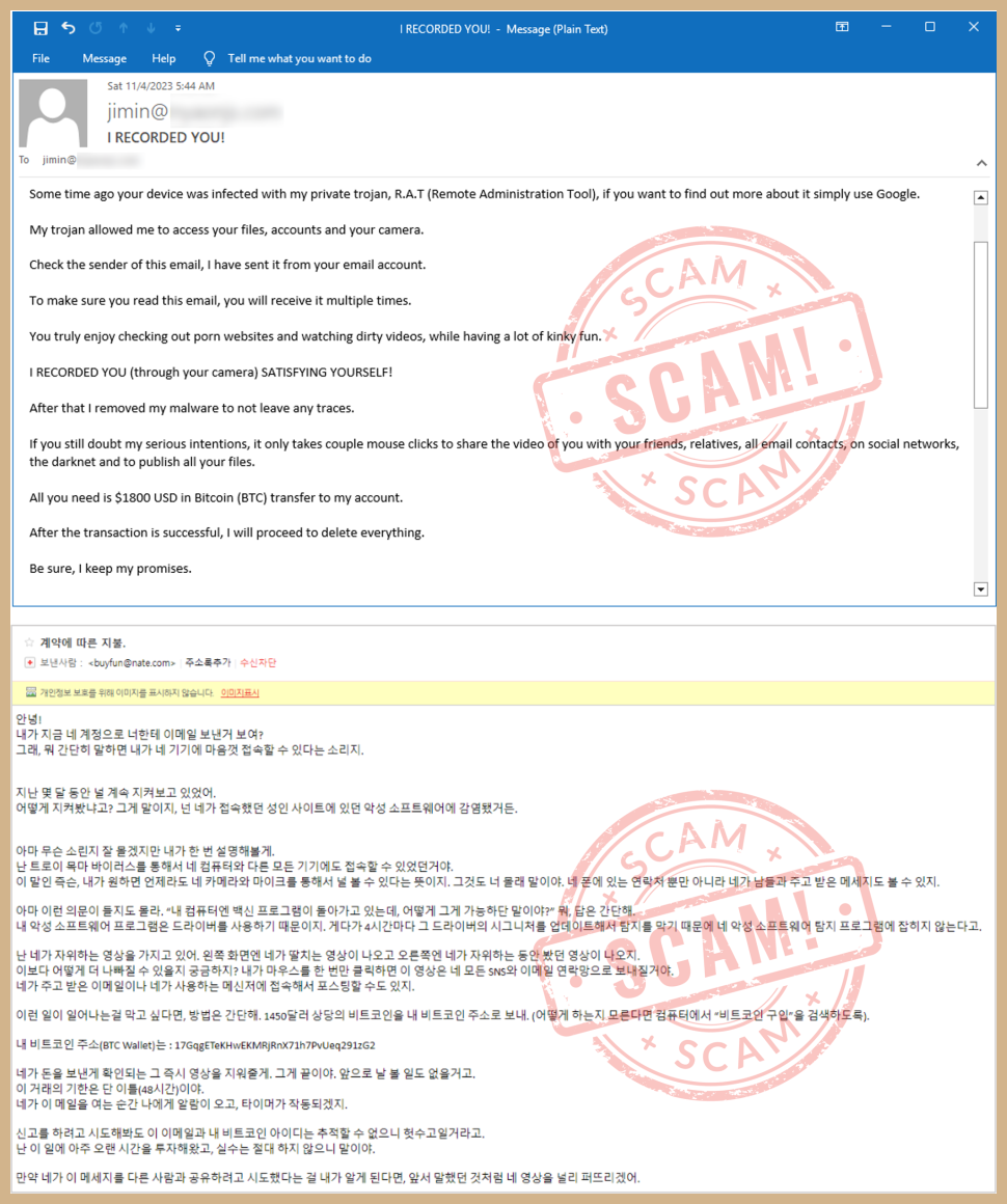 이러한 유형의 몸캠피싱은 범죄자가 피해자 PC에 악성코드를 설치 했고, 이를 이용해 정보를 빼냈으며, 지금도 여전히 화면을 녹화하고 있다는 등의 거짓말로 피해자를 속입니다. 스캐머(사기꾼)는 보통 이메일을 이용하여 임의의 상대방에게 접근하고, 더 큰 피해를 보지 않으려면 자신에게 가상자산을 전송하라고 협박합니다. 이러한 이메일을 받은 피해자는 덜컥 겁이 나거나 공황에 빠져 송금하게 됩니다. 그 어떠한 기술적인 수법 없이 단지 심리적 부담을 이용하여 돈을 강탈하는 몸캠피싱입니다.
