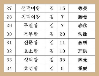 위의 그림이 신라왕 계보인데요. 맨 앞의 숫자가 몇 대 왕인지 보여주는 것이고요. 김이라는 글자는 성을 나타내는 것입니다. 김 다음의 숫자가 몇 년 동안 왕위에 있었는지 보여주는 것이고요. 그다음 한자는 휘를 나타낸 것입니다.