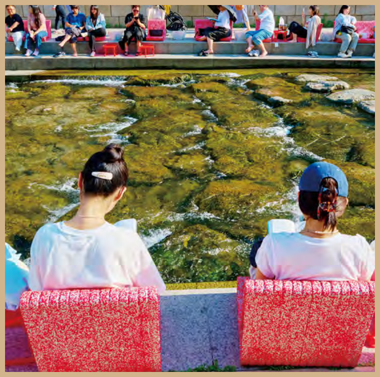 청계천 모전교 ~ 광통교 구간에 설치된 서울 색 의자에 앉아 책 바구니에 담긴 책을 볼 수 있습니다. 물소리와 음악 소리를 들으며 책을 읽다 보면 하루의 고단함이 날아갑니다. 이곳에는 다양한 연령대의 시민이 함께 읽을 수 있는 그림책과 신간, 교양 도서 등 2,000여 권의 책이 비치돼 있습니다. 레터링 네온사인, 플라워 포토 존에서는 특별한 추억을 담은 사진도 남길 수 있습니다.