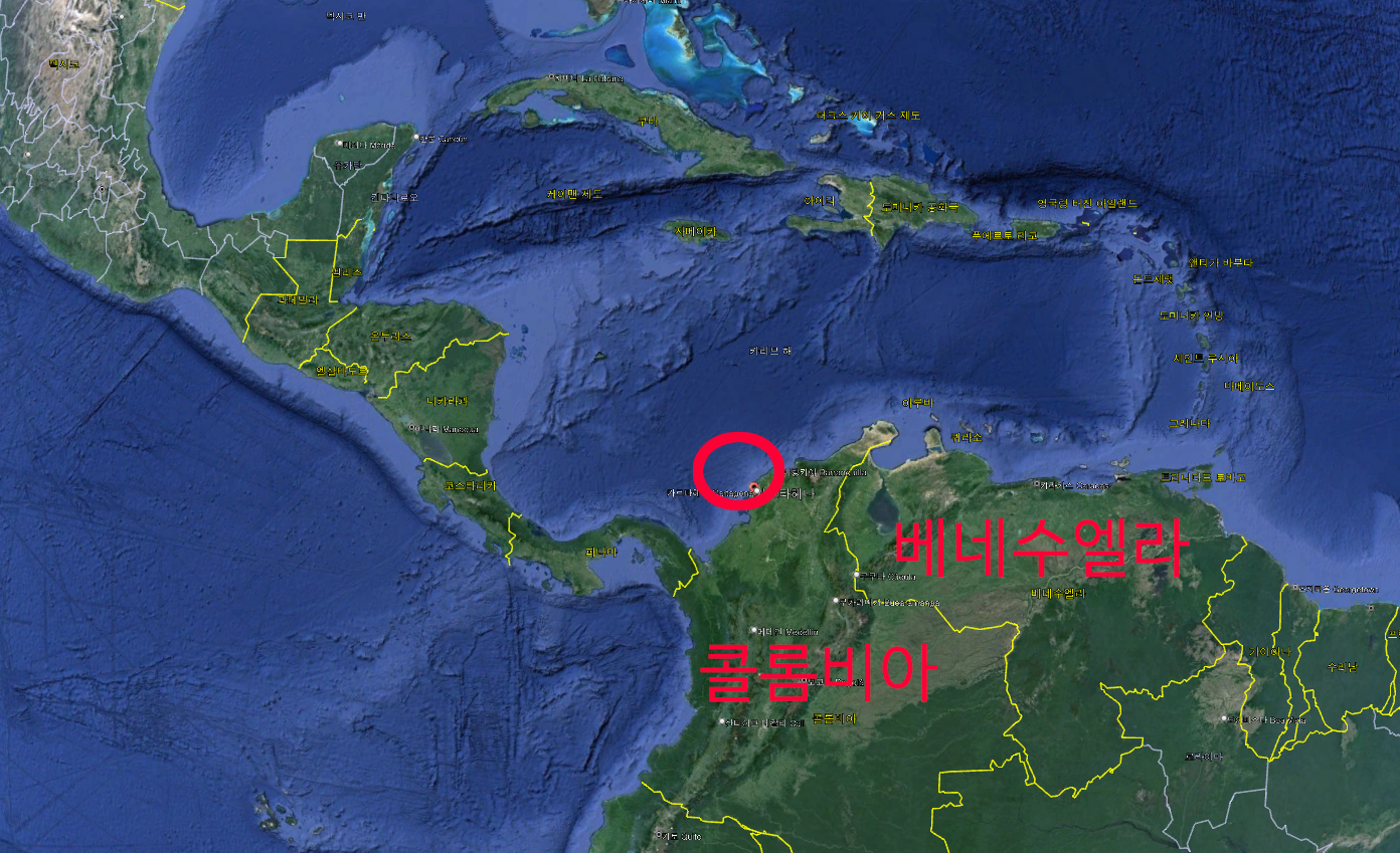 위의 빨간색 원이 산호세호가 잠겨 있는 곳의 위치입니다. 콜롬비아 앞바다에 있습니다.