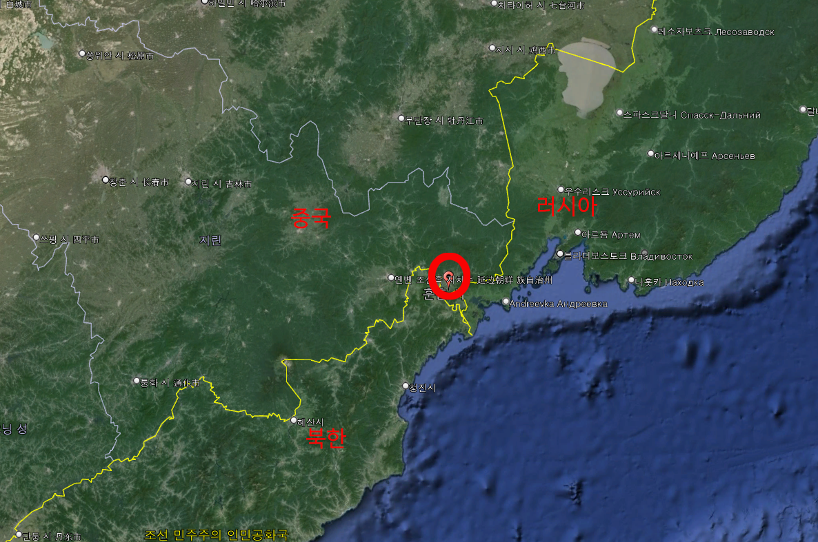 위의 빨간색 원이 훈춘의 위치입니다. 중국 영토입니다.