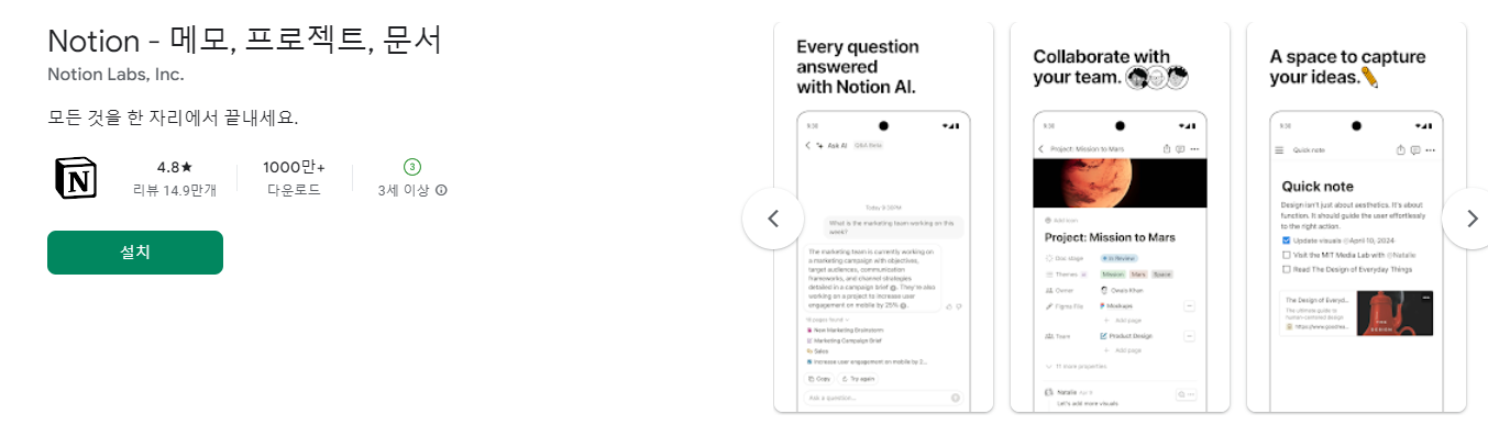 최근 인기를 끌고 있는 협업 및 메모 앱입니다. 노션은 메모, 작업 관리, 위키, 데이터베이스 등 다양한 툴을 하나의 작업 공간에 통합해 프로젝트, 문서, 지식 등을 체계적으로 관리할 수 있습니다. 노션의 가장 큰 특징인 블록 기반 에디터를 통해 텍스트, 이미지, 코드, 콘텐츠 임베드(Embed) 등 다양한 요소를 자유롭게 배치하고 구성할 수 있습니다. 노션에서는 팀원들과 문서 및 데이터베이스를 공유하고 동시에 작업할 수 있으며, 접근 권한도 세부적으로 설정할 수 있습니다. 노션은 메모는 물론 지식/태스트 관리/프로젝트 등 다양한 용도로 활용됩니다. 비록 유료 정책의 논란이 있지만, 협업과 정보 관리를 위한 강력한 툴로 자리 잡았습니다.