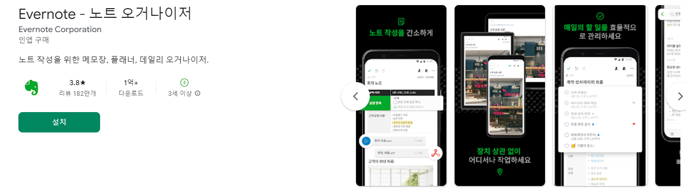 웹 클리퍼(Web Clipper)를 통해 웹 페이지 저장이 가능하며, 손 글씨 메모와 그림 그리기 기능을 지원합니다. 메모 검색 및 태그 기능을 지원하고, 다양한 기기에서 메모를 동기화할 수 있습니다. 에버노트는 유료 요금제를 기반으로 하고 있어 기본 무료 기능 회에 용량 확장을 위해서는 유료 요금제를 이용해야 합니다. 가격도 꽤 높은 편입니다.
