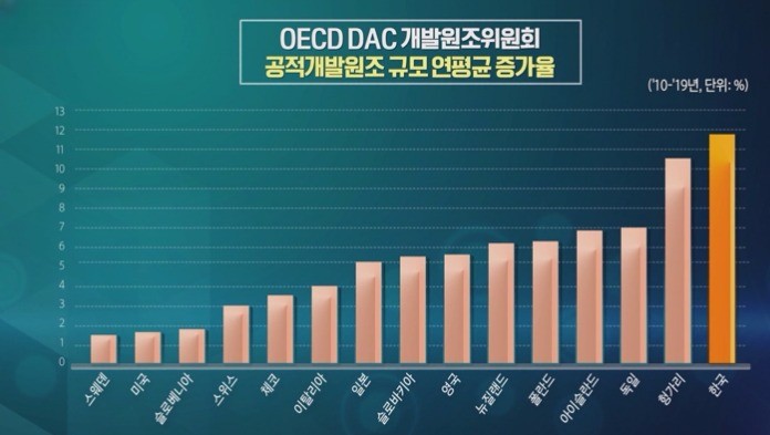 위의 그래프는 2019년 기준으로 공적개발원조 규모 연평균 증가율입니다. 한국은 최고 수준의 증가율을 보이고 있습니다. 하지만 객관적 규모 면에서는 평균 원조액의 절반 수준입니다. 2020년 기준으로 3.4조 원이 DAC 예산입니다.
