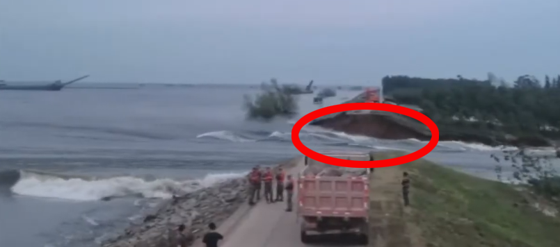 위의 사진이 둥팅호 제방이 무너진 모습인데요. 빨간 원 부분이 무너진 곳입니다. 저곳으로 많은 물이 빠져나가고 있는 상황입니다.