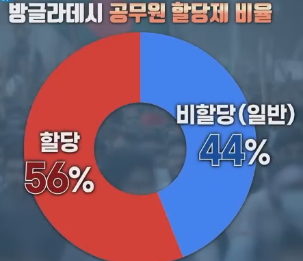 위의 그래프처럼 이번에 방글라데시 공무원 중 56%를 미리 할당된 사람을 앉히려고 하는 것에 방글라데시 사람들이 분노하고 있는 것입니다. 모두의 로망인 직업의 56%가 다른 사람 정해져 있는 것이고, 일반 사람은 44%에서 경쟁해야 하는 것에 불만이 있는 것입니다.