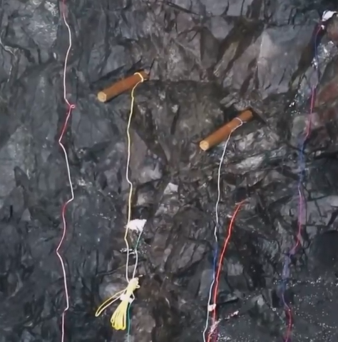 위의 사진은 구멍을 뚫는 작업을 다 하고 각 구멍에 화약을 집어넣고 전선을 연결한 모습입니다.