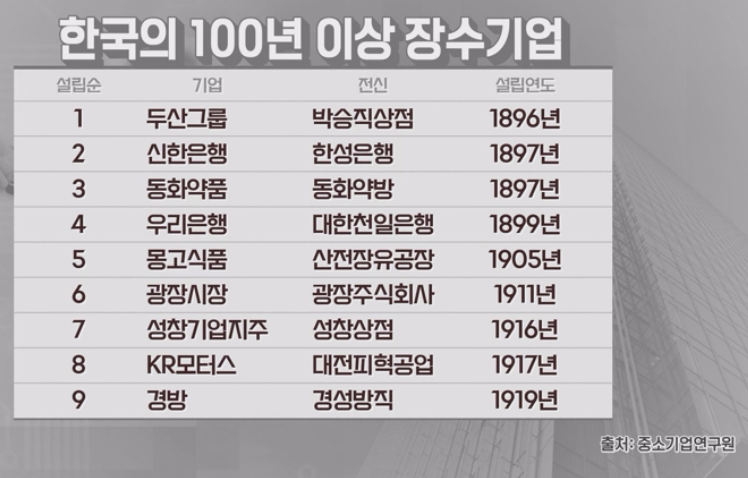 위의 사진이 바로 한국에서 100년 이상 된 명문장수기업 리스트입니다. 9곳 있습니다. 한국은 다른 선진국들에 비해 100년 이상 된 명문장수기업이 많이 없는 편입니다. 그 이유는 다른 나라는 산업혁명 때부터 이어져 오는 기업들도 많은 반면 우리나라는 1970년대 이후나 되어서야 산업화가 되었기 때문에 년수가 별로 안 돼 명문장수기업이 별로 없는 것입니다. 그만큼 우리나라가 고속 성장을 했다는 것을 보여주는 것이기도 합니다.
