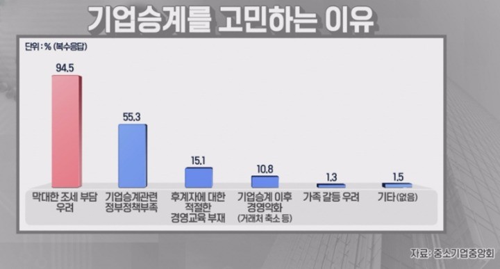 위의 그래프는 기업승계를 고민하는 이유를 설문조사 한 결과인데요. 1위가 막대한 조세 부담 우려, 2위가 기업승계 관련 정부 정책 부족 때문입니다. 1위와 2위 둘 다 정부의 정책 때문에 기업승계를 고민한다는 말입니다.