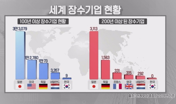100년 이상 된 장수기업이 있는 개수는 일본이 33,079곳, 미국이 12,780곳, 독일이 10,073곳, 네덜란드가 3,357곳 있는 반면 우리나라는 9곳 있습니다. 200년 이상 된 장수기업도 일본은 3,113곳, 독일은 1,563곳, 프랑스는 331곳, 영국은 315곳, 네덜란드는 292곳, 한국은 0곳입니다.