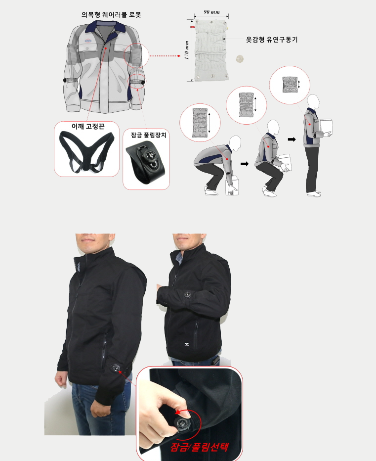 유연구동기와 배터리, 제어기등을 모두 포함한 의복형 웨어러블 로봇 의 총무게는 1kg으로 일반적인 점퍼정도의 무게입니다. 또 사람이 선택적으로 웨어러블 로봇을 작동할 수 있어 전력낭비가 적은 특징이 있습니다.