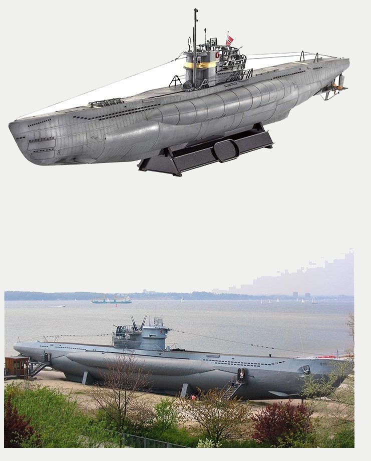 u보트 의 양 끝에는 어뢰를 발사하는 튜브가 있는데, 어뢰는 7m 길이의 수중 미사일입니다. 독일 잠수함 가운데는 전망탑이 있고, 그 밑에는 조향, 잠수, 부상을 제어하는 복잡한 기관이 있습니다. 잠수할 때 u보트 의 생존은 압력 선체에 달려있습니다. 밖에서는 보이지 않는 이 늑골 구조와 철판이 수천 톤의 바닷물로부터 선원을 보호합니다.